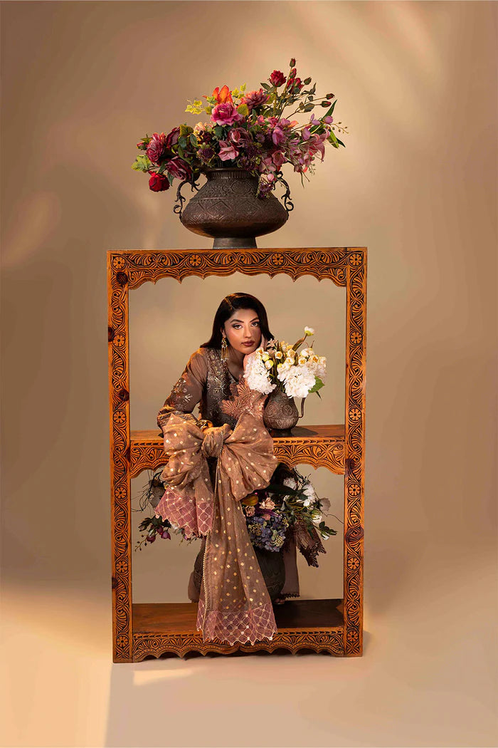 - Front Embroidered & hand embellished neckline with 3D flowers shirt finished with embroidered organza daman