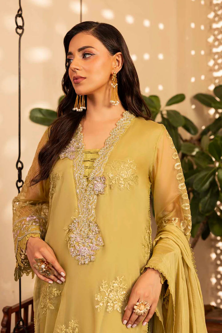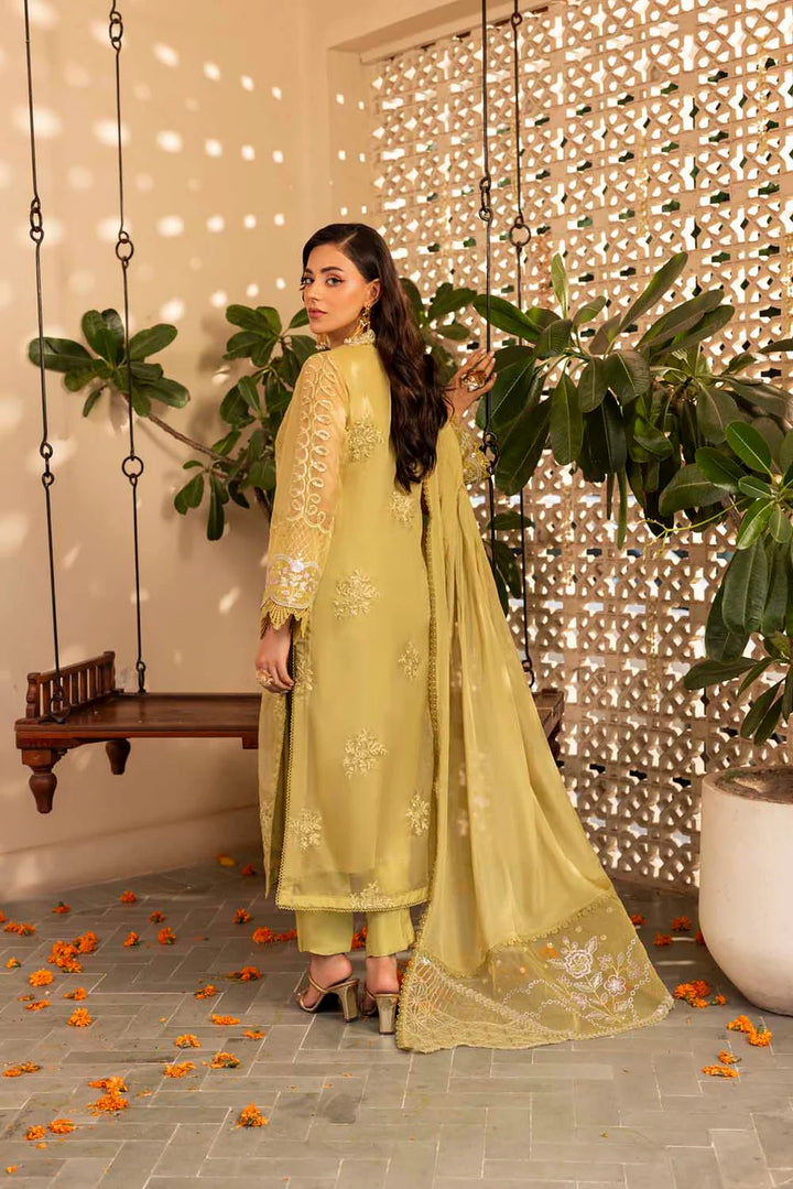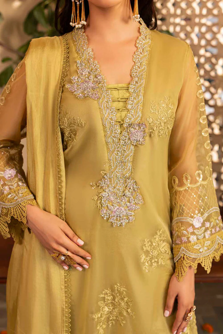 - Organza embroidered shirt neckline finished with hand embellished 3D motifs.