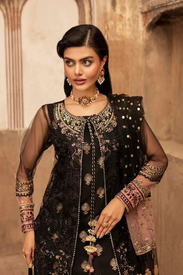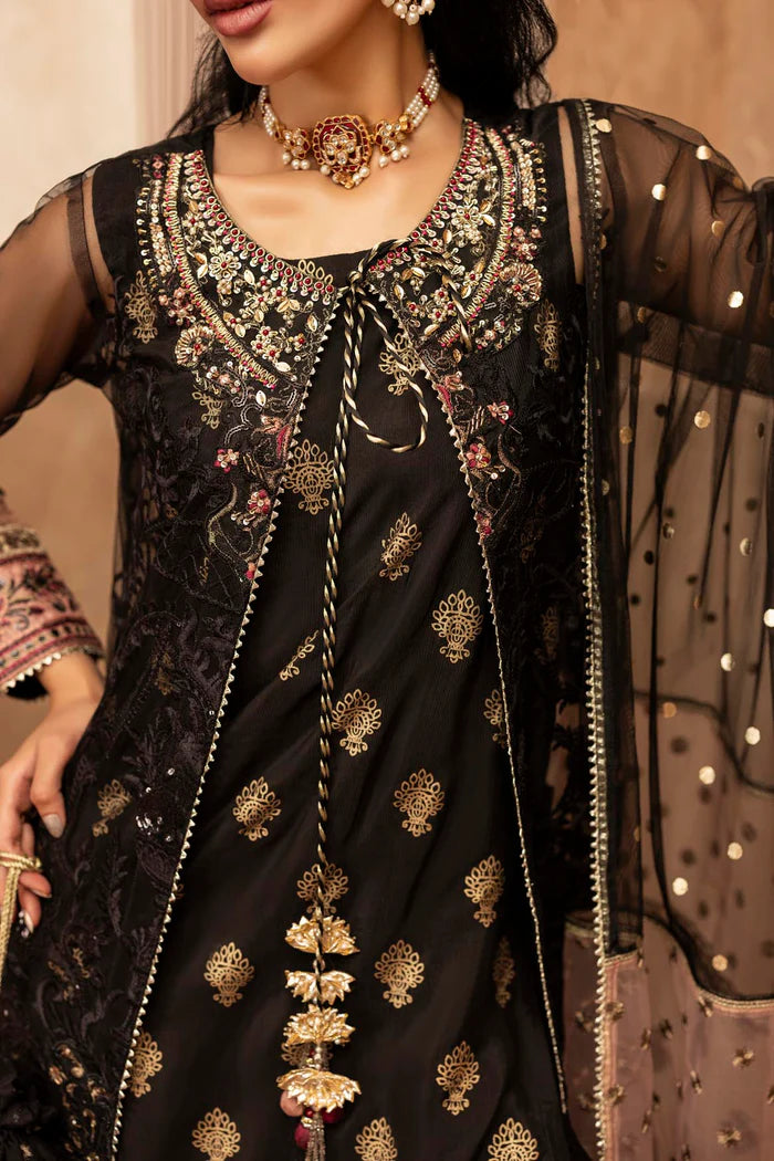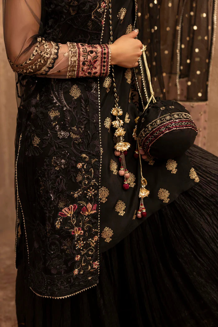 Gown: Embroidered net gown with hand-embellished neckline & daman motif, finished with dori tassels.