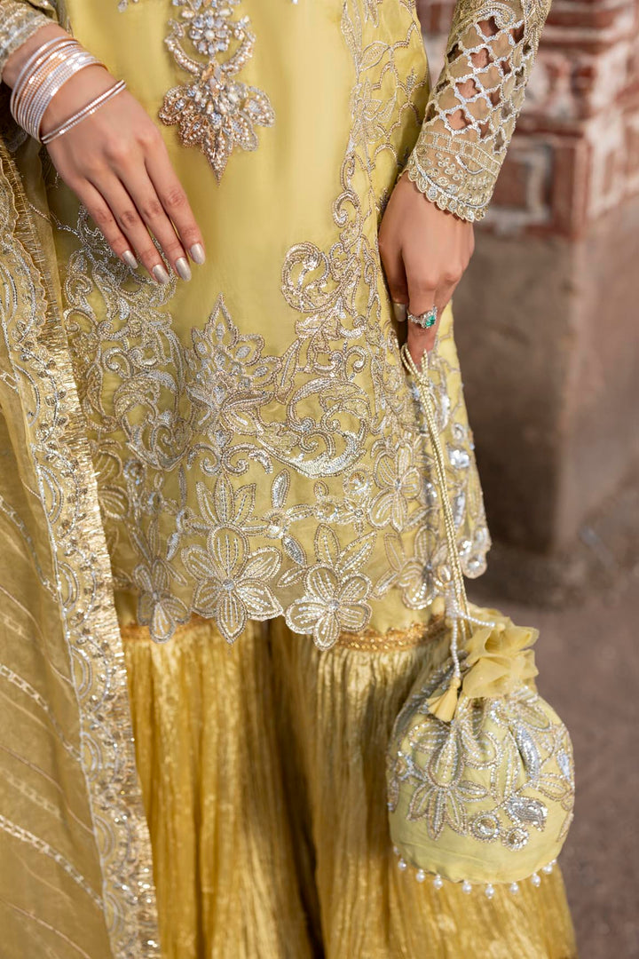 Dupatta: Embroidered organza dupatta finished with zari kiran lace.