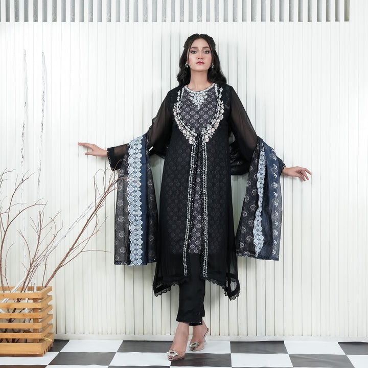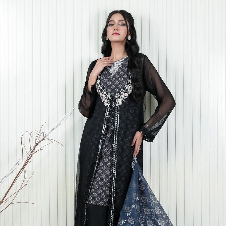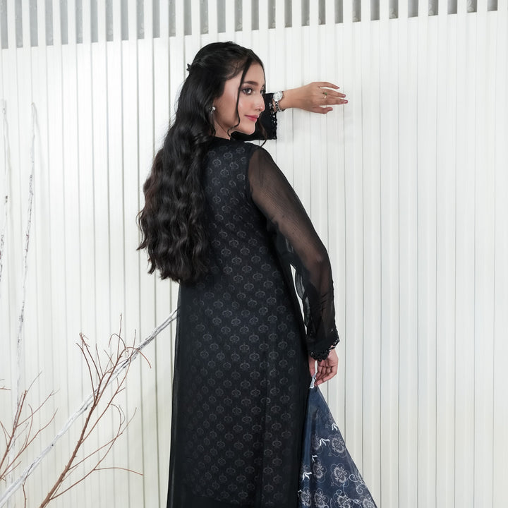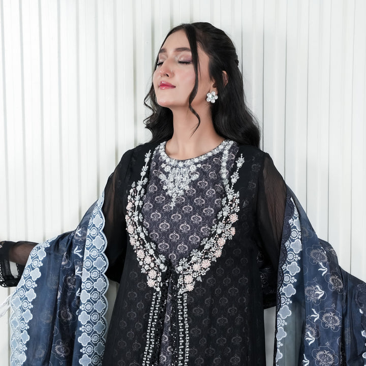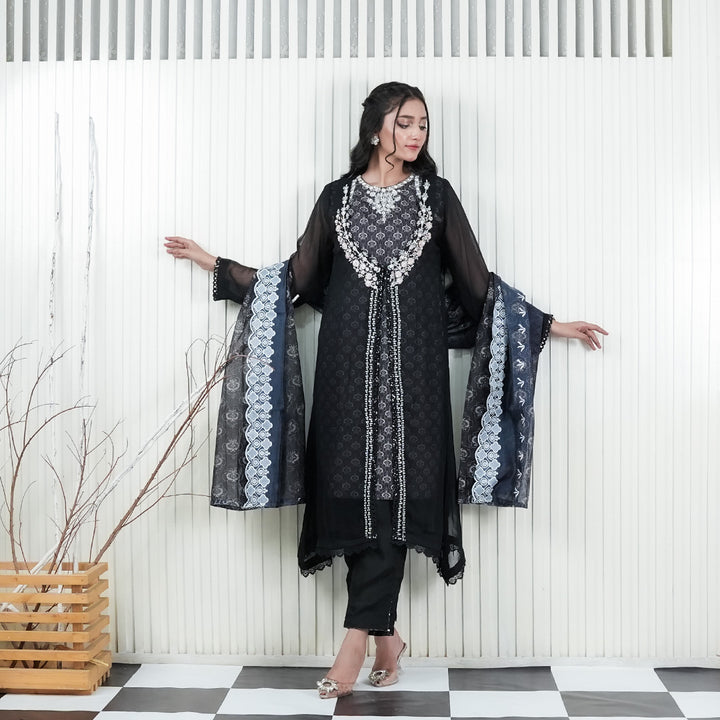 Discover sophistication with "The Wardrobe" ensemble in a striking black combination. The gown is crafted from lightweight chiffon, offering a graceful silhouette, while the printed silk pants add a touch of flair. Completing the look is a soft organza dupatta with elegant embroidery, making this outfit perfect for any special occasion.