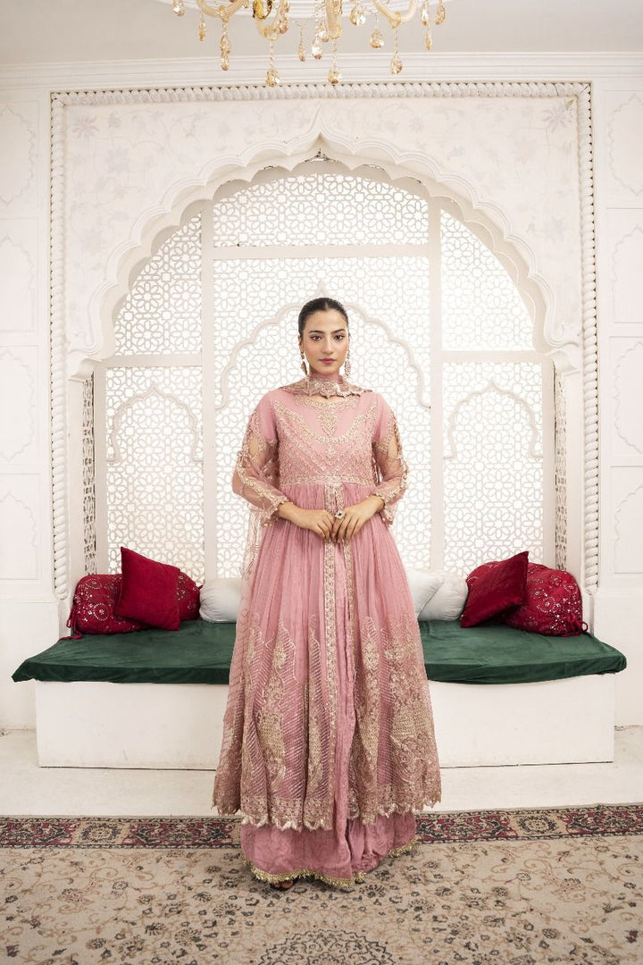 This gorgeous silhouette features a paneled floor length layered maxi made from premium quality fine soft net in the shades of maroon. Noteworthy details unveil composed embroidery on yoke and along the panels with a touch of direct adda work. Hem of maxi is adorned with organza border featuring hand work and cutwork detailings, longer layer of maxi finished with gold fancy lace. Further enhanced with embroidered sleeves displaying borders at hem – finished with direct adda work and lace.