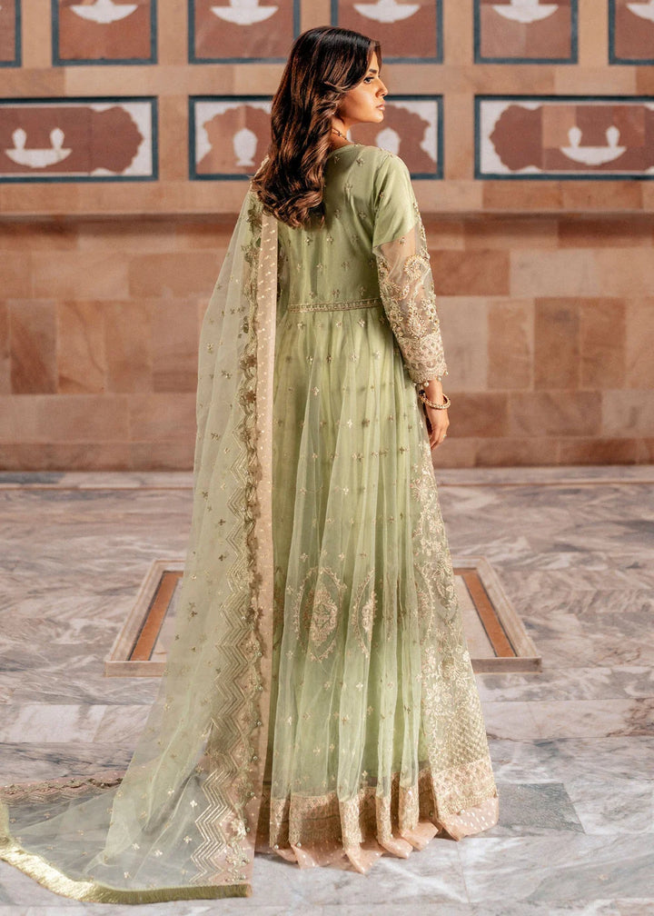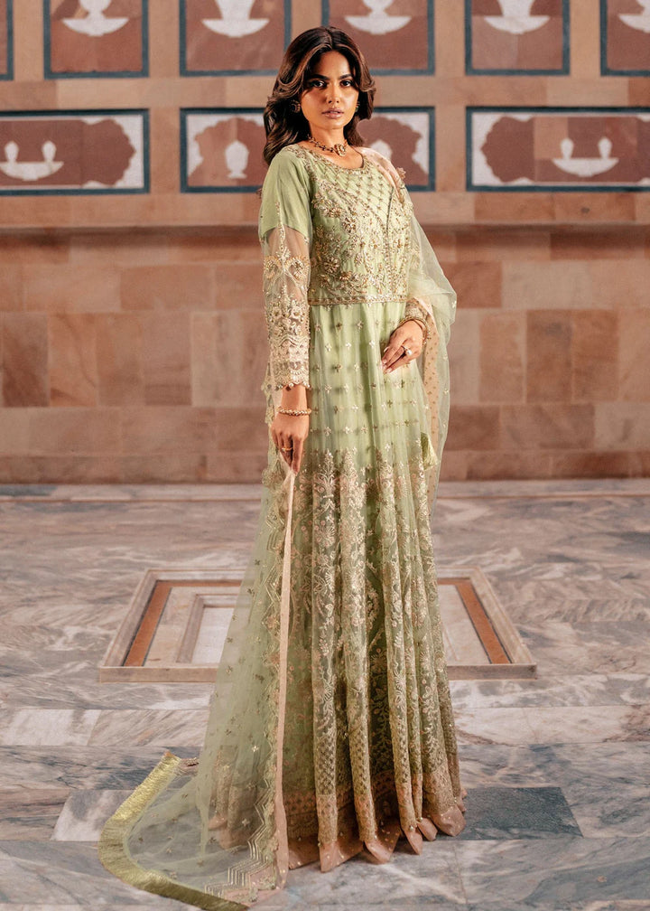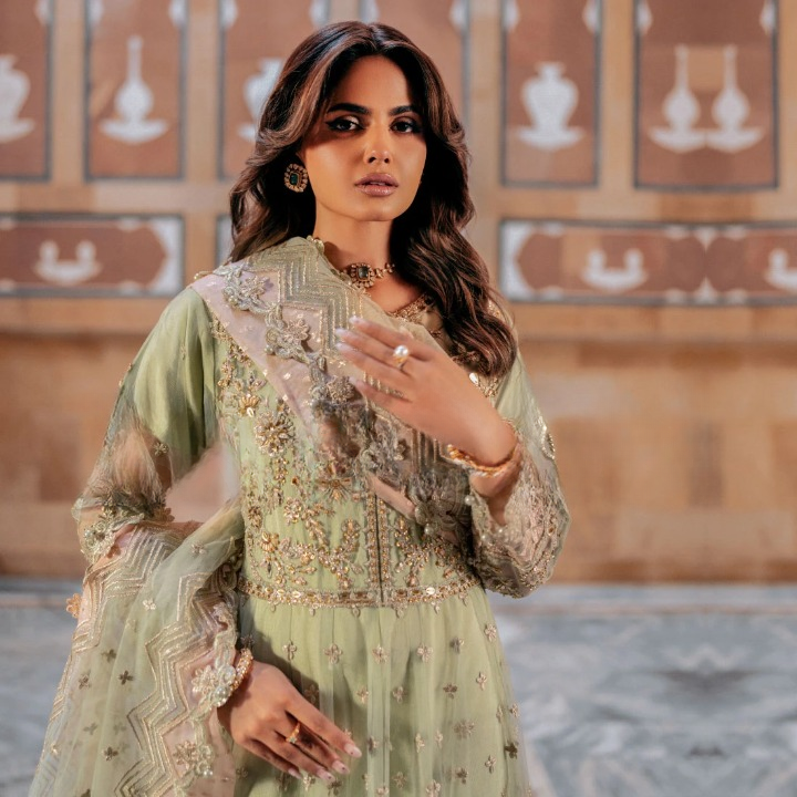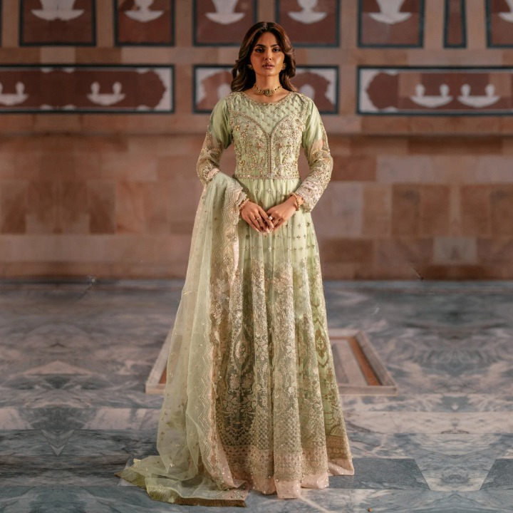 The look is completed with a soft net dupatta, gracefully embellished with pearls along all four sides and meticulously finished in cutwork style.