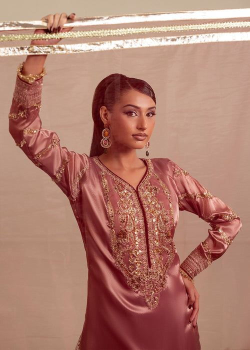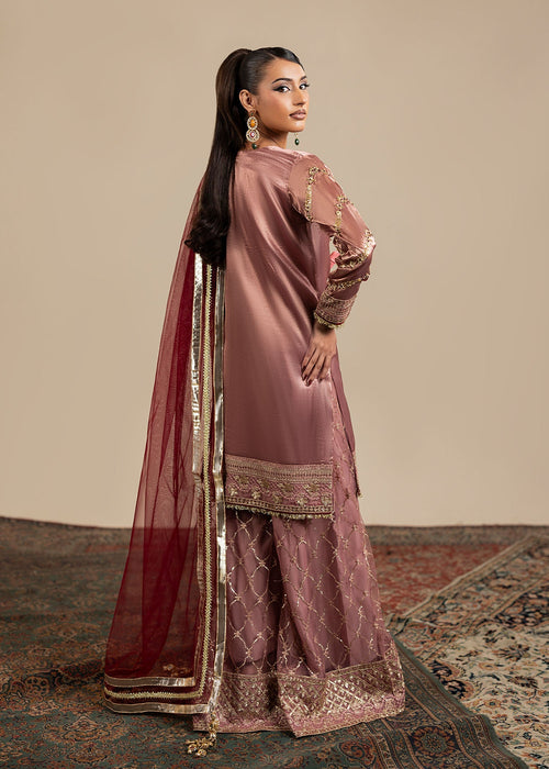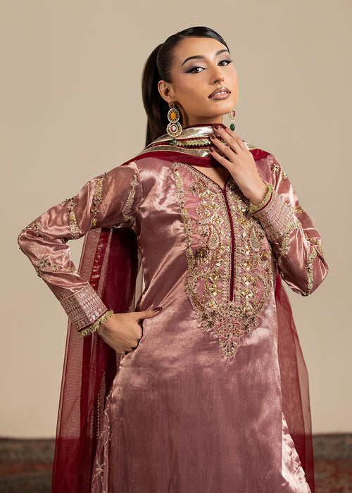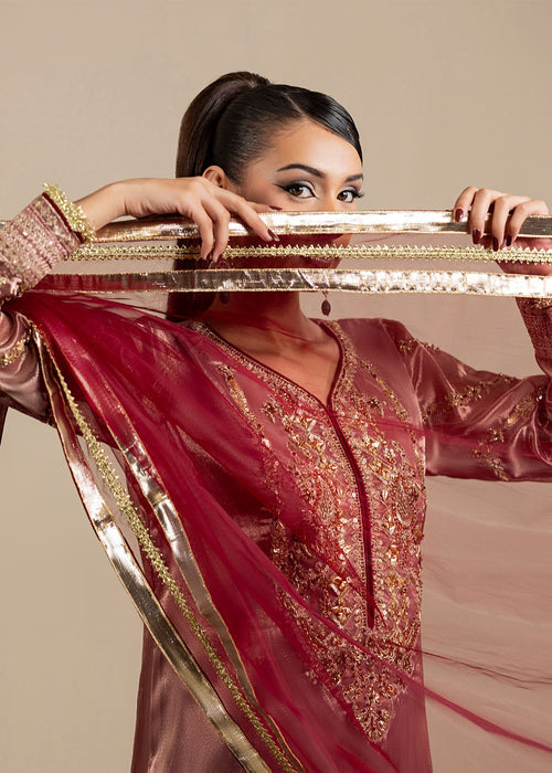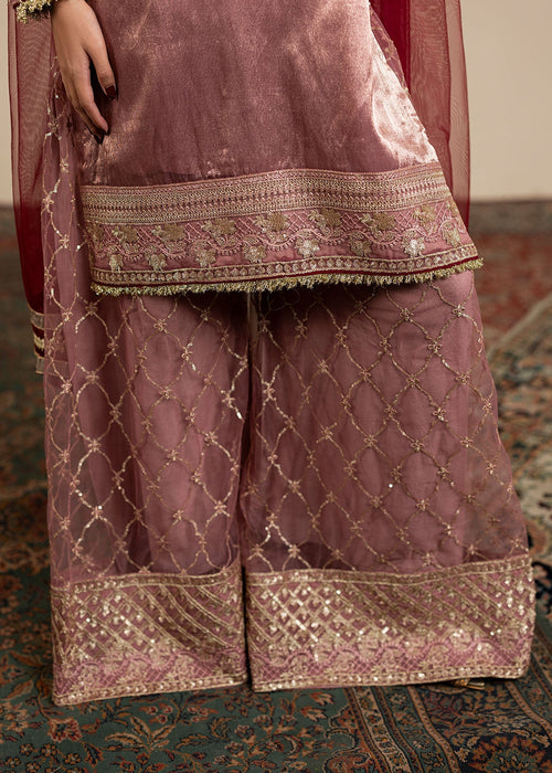 Additional Description: Embroided and embellished tissue short shirt paired with Net sharara and net duppata completes the whole look