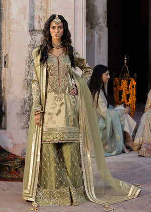 Additional Description: Embroided and embellished tissue short shirt paired with Net sharara and net duppata completes the whole look